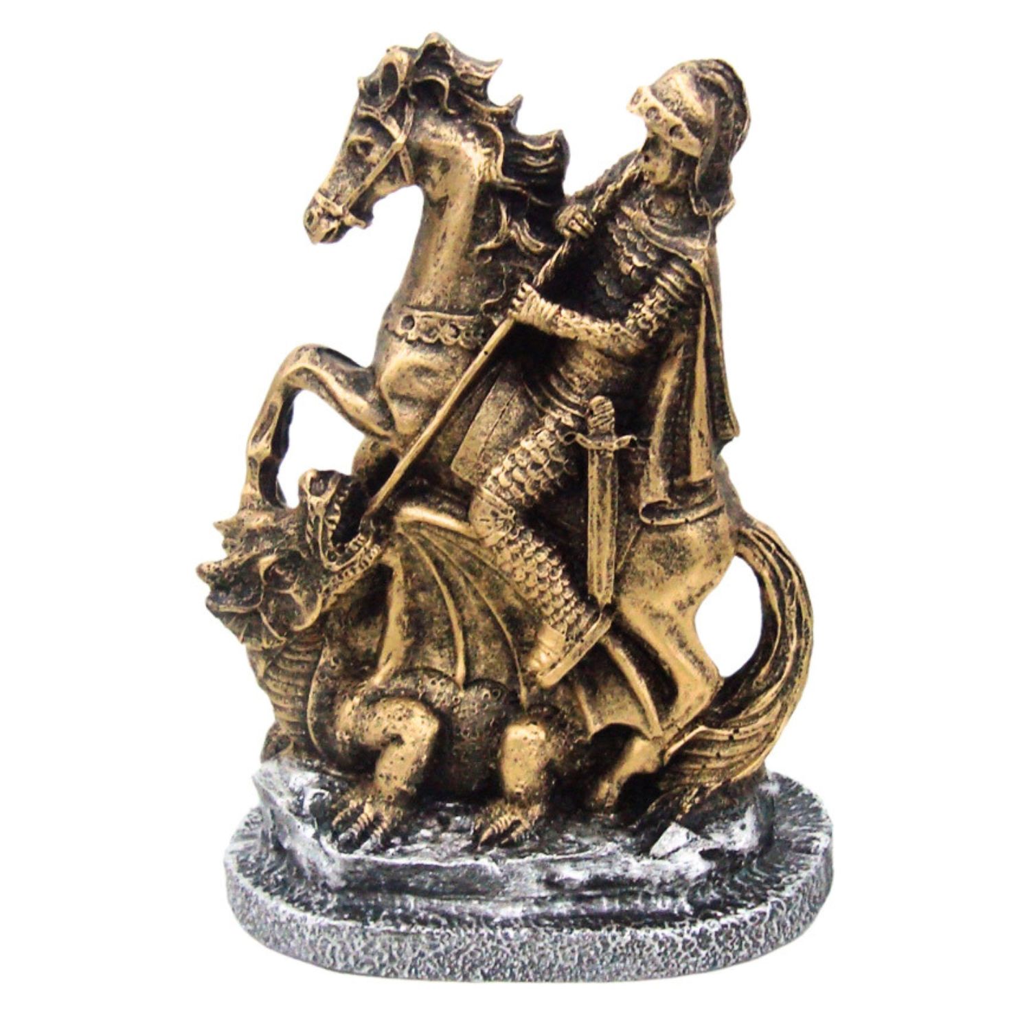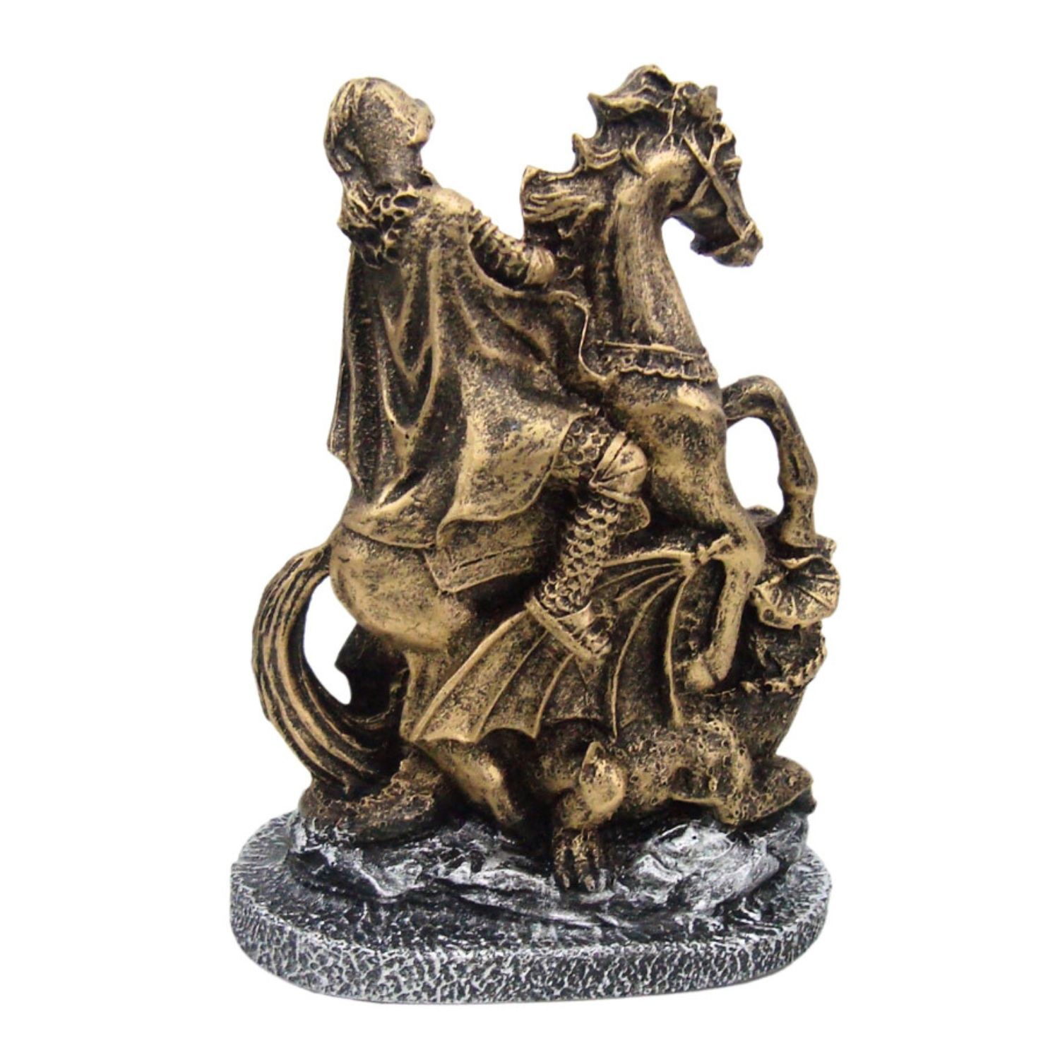 Uma estatueta de São Jorge é uma escultura que retrata o santo cristão conhecido por sua coragem e luta contra o mal. São Jorge é um dos santos mais populares e venerados em várias tradições cristãs, sendo considerado o padroeiro de diversas cidades e países. A estatueta de São Jorge geralmente representa-o montado em um cavalo, empunhando uma lança e lutando contra um dragão. Essa imagem simboliza a luta entre o bem e o mal, com São Jorge representando a coragem e a vitória sobre as forças negativas.